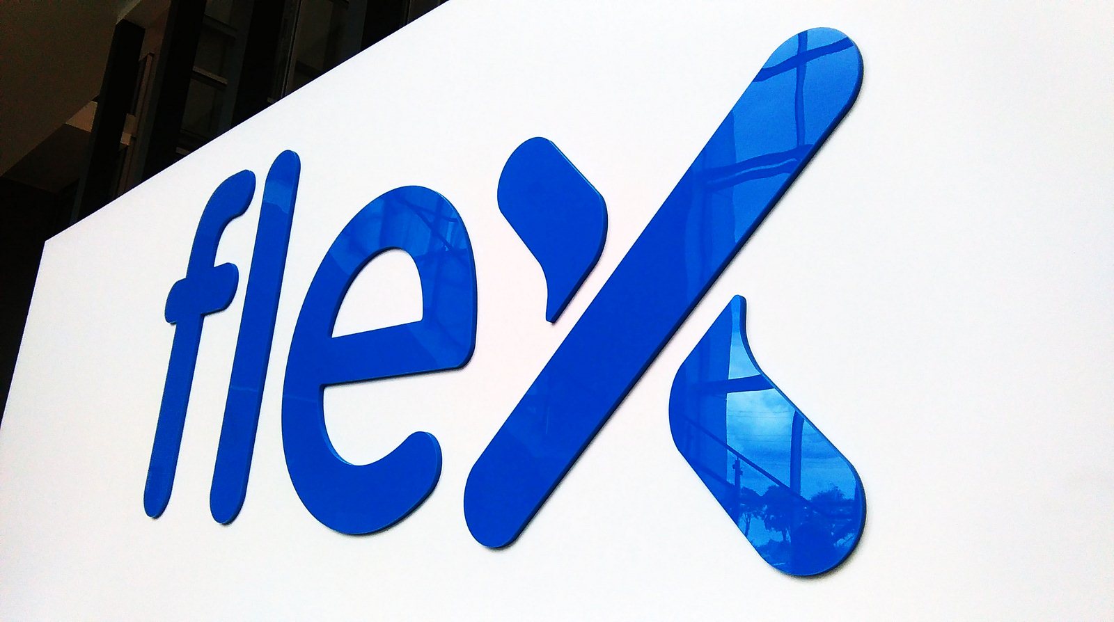 Logotyp przestrzenny z malowanego styroduru z licem z plexi. Kilka różnej wielkości logotypów montowanych w firmie FLEX.